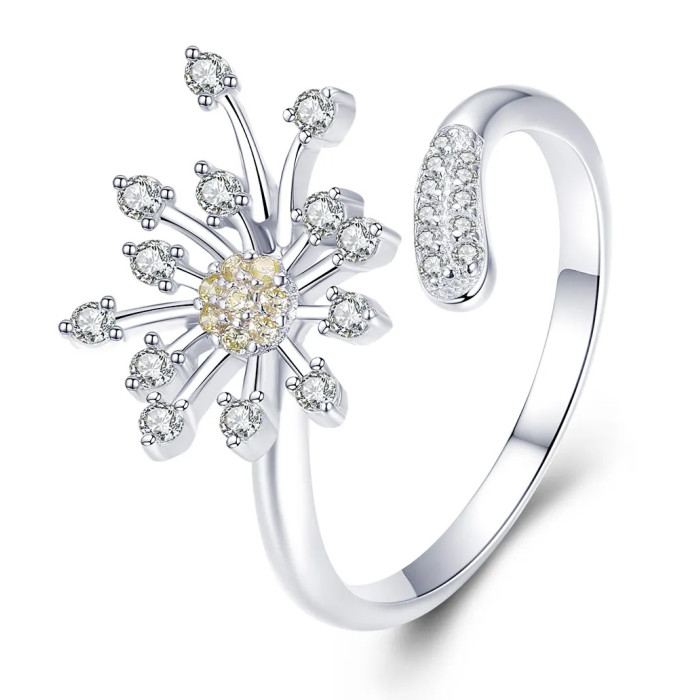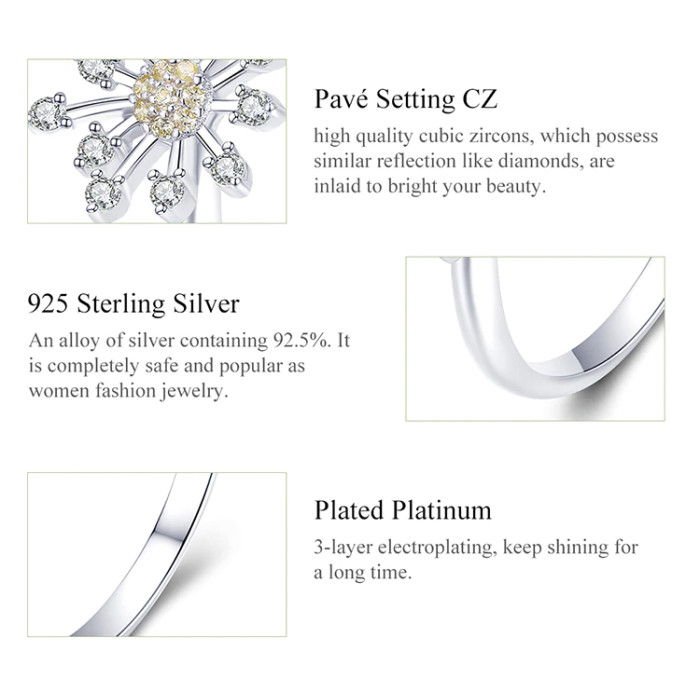 Εντυπωσιακό δαχτυλίδι, σε σχήμα dandelion, διακοσμημένο με αστραφτερή κυβική ζιρκόνια, λευκού χρώματος και χρυσού χρώματος, η οποία αντανακλά μοναδικά το φως και προσφέρει λάμψη στο κόσμημα.