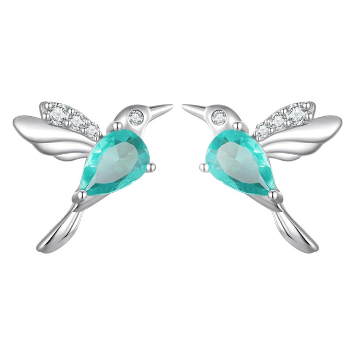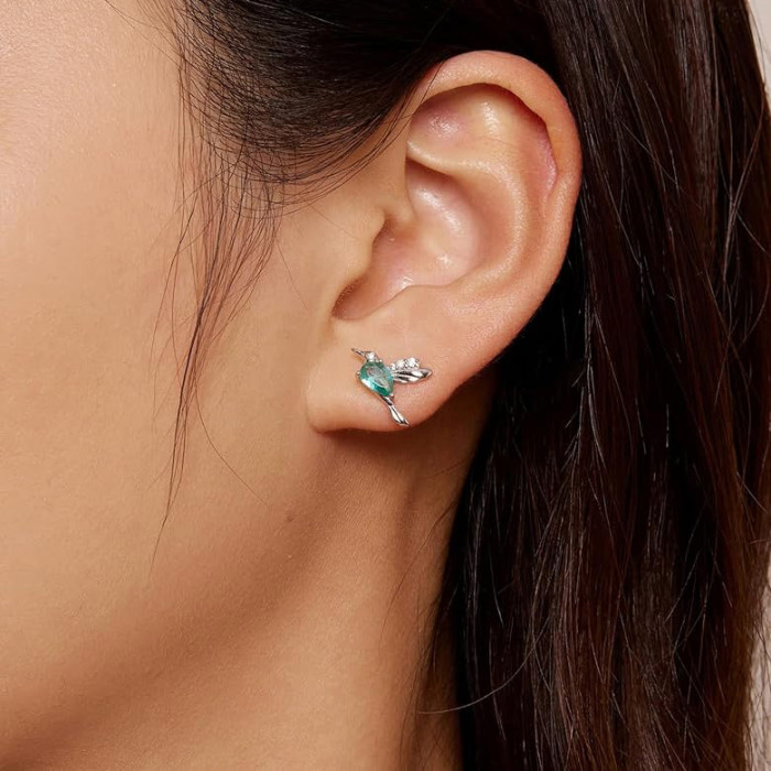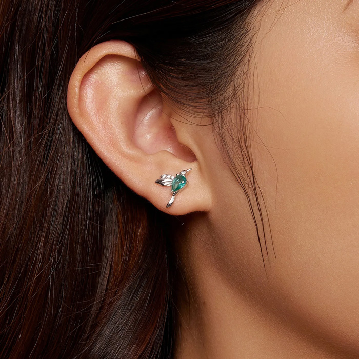 Καρφωτά σκουλαρίκια με σχήμα πουλιού Bamoer, κατασκευασμένα από ασήμι 925, διακοσμημένα με διάφανο κρύσταλο βεραμάν χρώματος και αστραφτερή κυβική ζιρκόνια λευκού χρώματος.