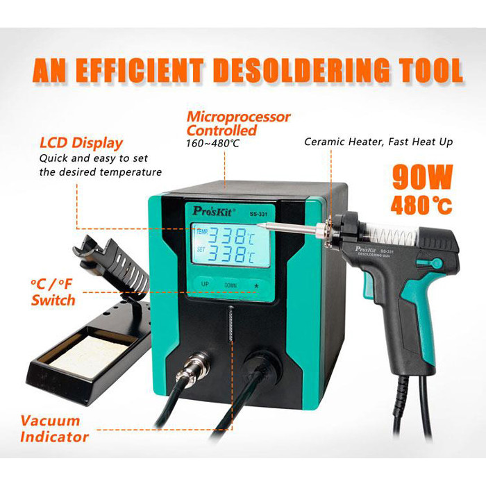 Ο σταθμός αποκόλλησης SS-331B της PROSKIT είναι ένα πρακτικό εργαλείο για εργασίες αποκόλλησης με ισχύ 140W και ρυθμιζόμενη θερμοκρασία από 160 έως 480 °C.