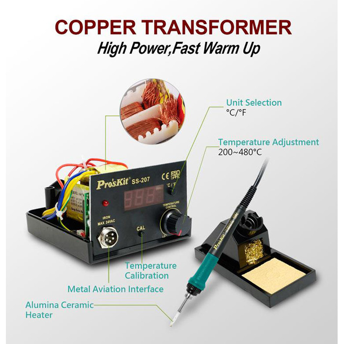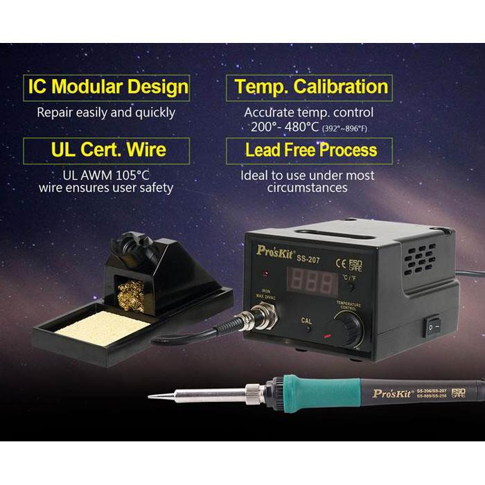 Ο σταθμός συγκόλλησης SS-207B της PROSKIT είναι ένα πρακτικό εργαλείο συγκόλλησης με ισχύ 60W και ρυθμιζόμενη θερμοκρασία από 200 έως 480 °C.