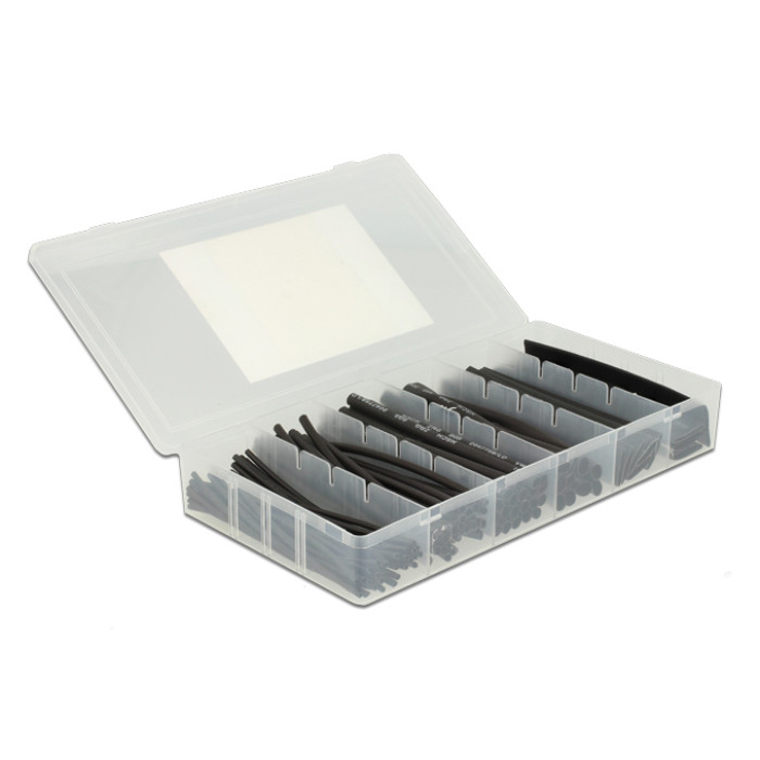 Το σετ περιλαμβάνει 100 θερμοσυστελλόμενα μαύρου χρώματος σε 6 διαφορετικές διαμέτρους. Είναι τοποθετημένα μέσα σε πλαστικό κουτί για την ταξινόμηση και προστασία των μονωτικών το οποίο μπορεί να επαναχρησιμοποιηθεί για την αποθήκευση διαφόρων αξεσουάρ.