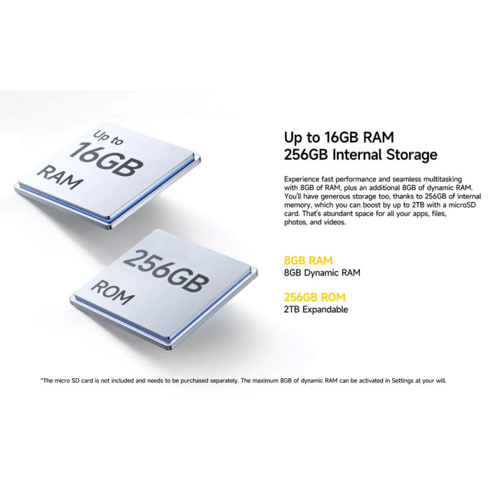 Με 8GB (+8GB virtual) RAM και 256GB ROM για να αποθηκεύετε τα αγαπημένα σας αρχεία, φωτογραφίες και βίντεο. Επιπλέον, προσφέρει την δυνατότητα να επεκτείνετε τον χώρο αποθήκευσης του smartphone με κάρτα micro SD έως 2TB.