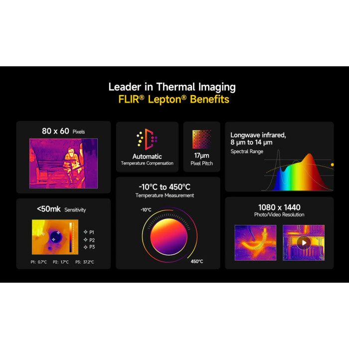 -Θερμική εικόνα: Thermal by FLIR. Thermal Resolution: 80x60. Refresh Rate: 9Hz. Pixel Pitch: 17μm. Sensitivity: <50mk. Measurable Temperature Range: -10 °C to 450 °C. Accuracy: +/-3 °C.