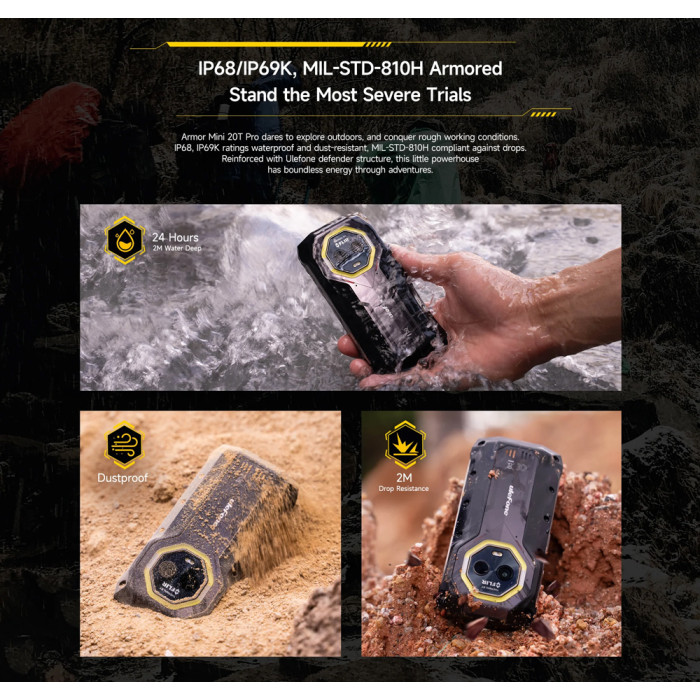 Με βολικό μέγεθος τσέπης, πιστοποίηση IP68/IP69K και πρότυπο MIL-STD-810H, το Armor Mini 20T Pro είναι σχεδιασμένο για να αντέχει σε ακραίες συνθήκες χρήσης και περιβάλλοντα.