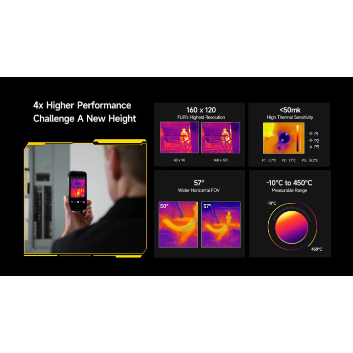 Με τον αισθητήρα θερμικής εικόνας FLIR μπορείτε να ανιχνεύετε με θερμική εικόνα, θερμοκρασίες από -10 °C έως 450 °C.