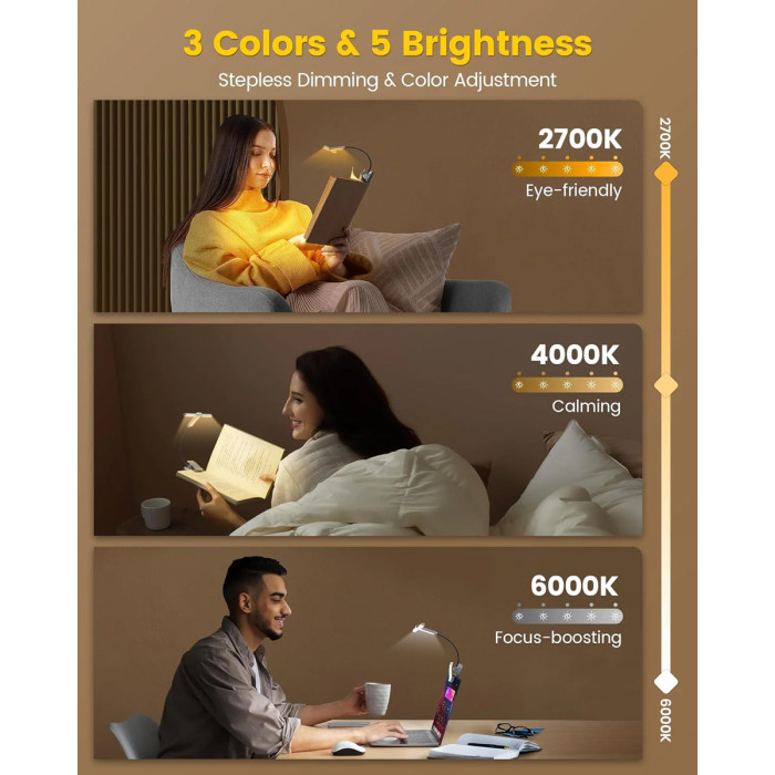 Ο εύκαμπτος βραχίονας σας επιτρέπει να ρυθμίζετε τη γωνία φωτισμού όπως επιθυμείτε, ενώ το πρακτικό κλιπ στερέωσης εξασφαλίζει σταθερό κράτημα στο βιβλίο.