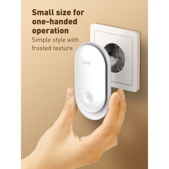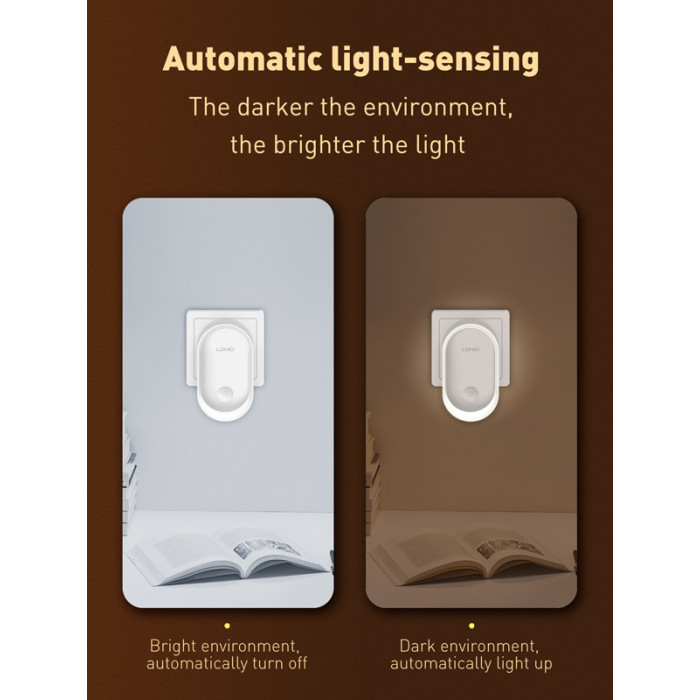 Φωτιστικό νυκτός της LDNIO με αισθητήρα φωτός για την αυτόματη ενεργοποίηση του φωτιστικού όταν βραδιάζει. Διαθέτει πολυλειτουργικό διακόπτη για την ρύθμιση της φωτεινότητας και εναλλαγή λειτουργίας (light sensitive mode, light off mode).