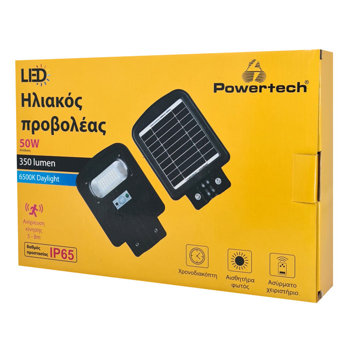 LED ηλιακός προβολέας εξωτερικού χώρου της Powertech με ισχύ 50W. Ενσωματώνει αισθητήρα κίνησης με εμβέλεια ανίχνευσης έως 8 μέτρα και αισθητήρα φωτός που επιτρέπει την αυτόματη ενεργοποίηση του φωτιστικού την νύχτα και απενεργοποίηση του την ήμερα.