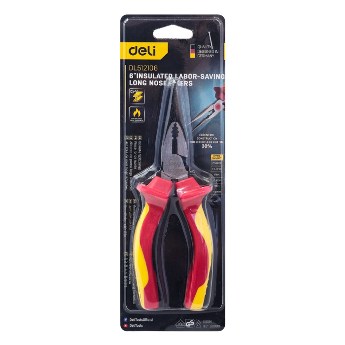 DELI μυτοτσίμπιδο ίσιο ηλεκτρολόγου DL512106 με αντιολισθητικές λαβές, VDE 1000V, 160mm