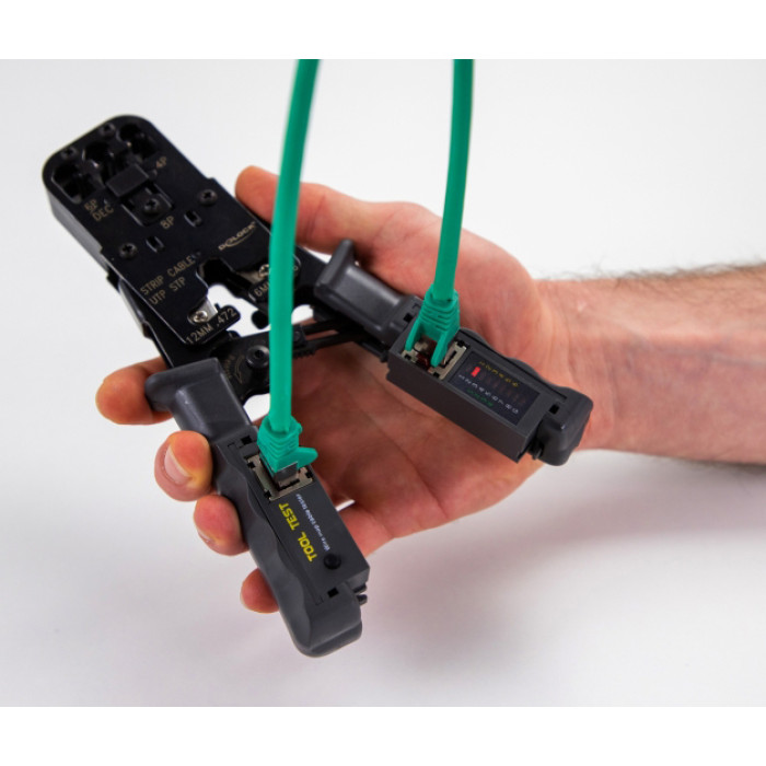 Διαθέτει ενδείξεις LED για τον έλεγχο των pin της καλωδίωσης ανάλογα με τον τύπο του βύσματος (1 - 8 +G για RJ45, 1 - 6 για RJ11 και 1 - 4 για RJ10).