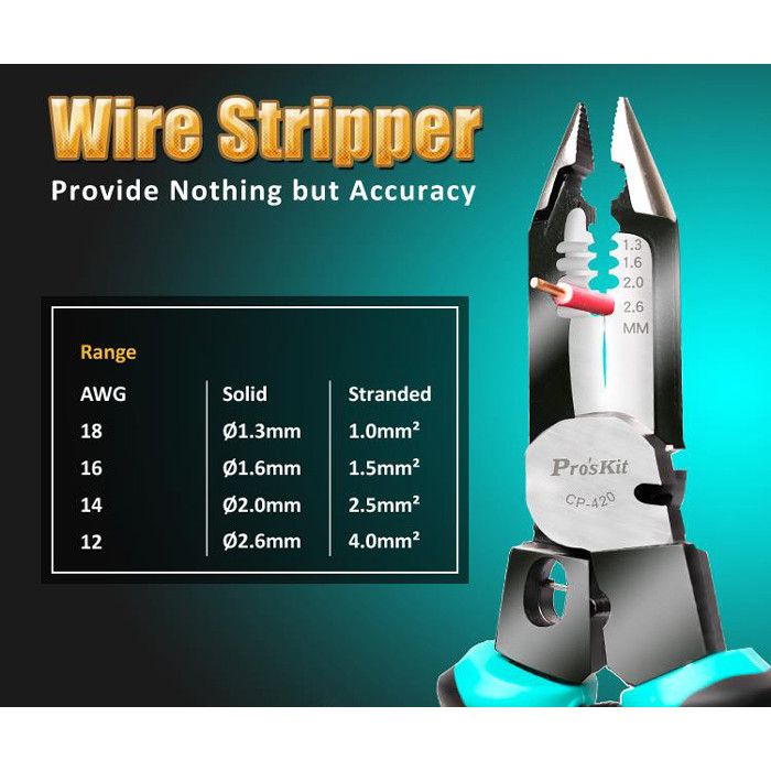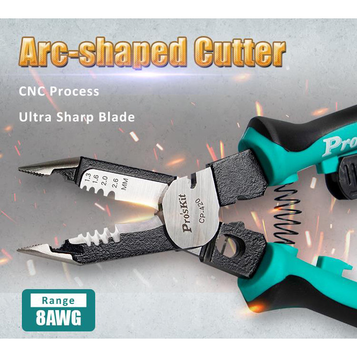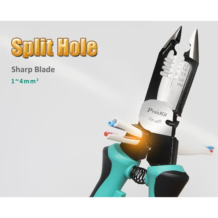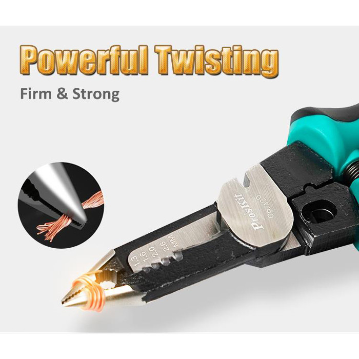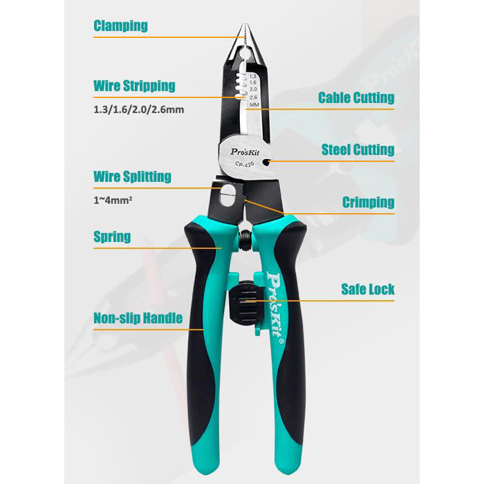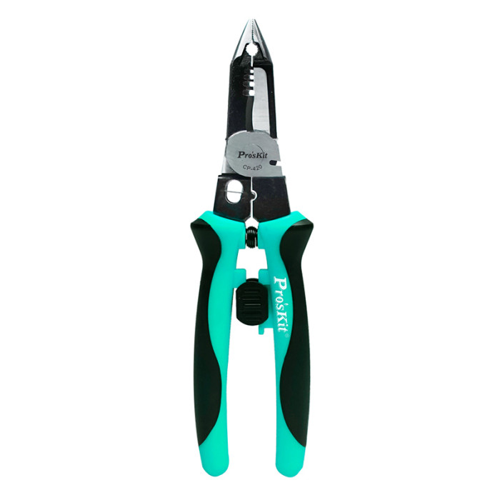 Πολυλειτουργική πένσα της PROSKIT, κατάλληλη για την απογύμνωση και διαχωρισμό καλωδίων, κοπή συρμάτων, πτύχωση τερματικών και σύσφιξη παξιμαδιών.