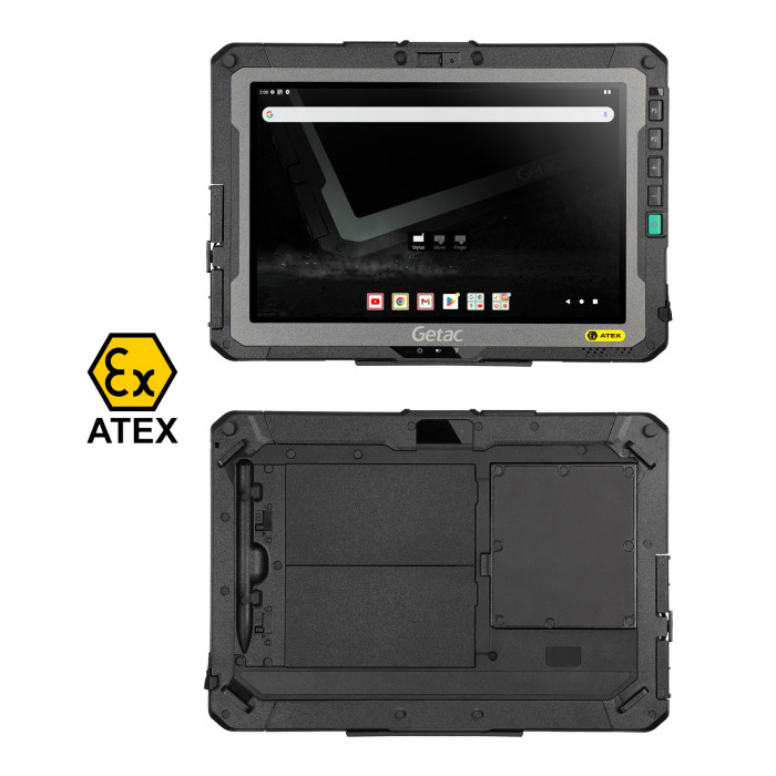 Εξαιρετικά ανθεκτικό tablet ZX10-EX της GETAC με ATEX και IECEx explosionproof πιστοποίηση, σχεδιασμένο για επαγγελματική χρήση σε βιομηχανικά περιβάλλοντα υψηλού κινδύνου, όπου υπάρχουν εκρήξιμα αέρια ή σκόνες.