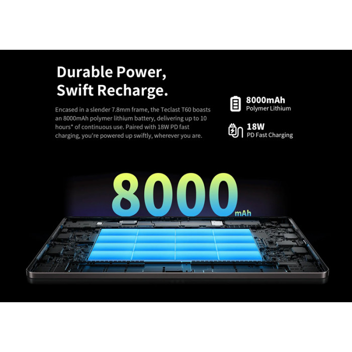 Η μπαταρία μεγάλης χωρητικότητας 8000mAh προσφέρει μεγάλη αυτονομία που θα σας απαλλάξει από τις συχνές αναζητήσεις τροφοδοσίας.