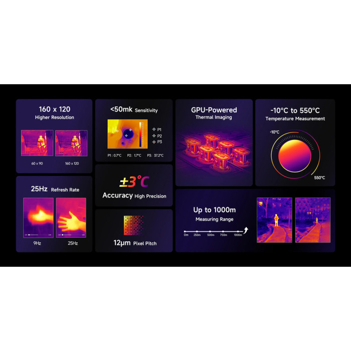 -Θερμική εικόνα: Thermal by ThermoVue. Thermal Resolution: 160x120. Frame Rate: 25Hz. Pixel Pitch: 12μm. Sensitivity: <50mk. Measurable Temperature Range: -10 °C to 550 °C, Accuracy: +/- 3 °C.