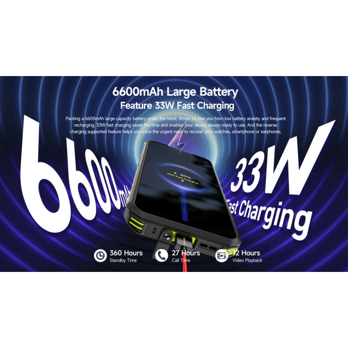 Με μπαταρία 6600mAh, το Armor 22 προσφέρει μεγάλη αυτονομία, που θα σας απαλλάξει από τις συχνές αναζητήσεις τροφοδοσίας, ενώ υποστηρίζει ταχεία φόρτιση με απόδοση 33W.