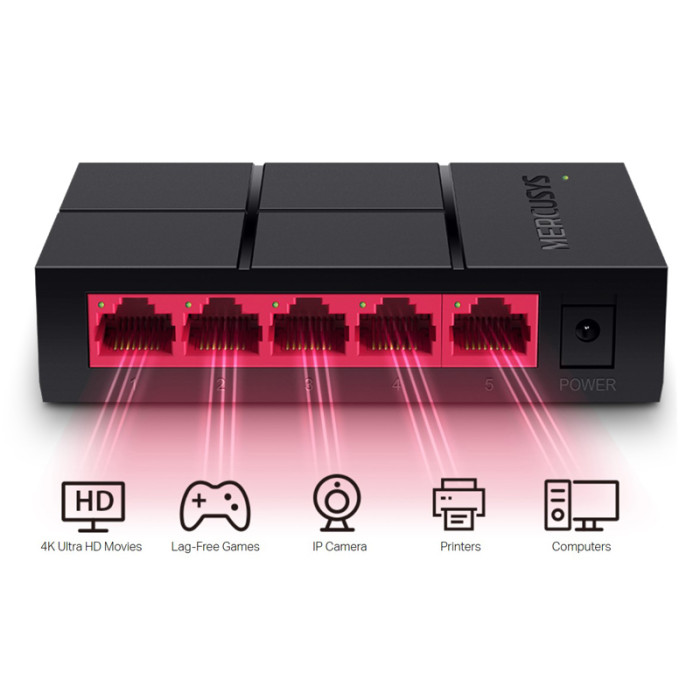 -Five 10/100/1,000 Mbps auto-negotiation RJ45 ports with auto MDI / MDIX supported