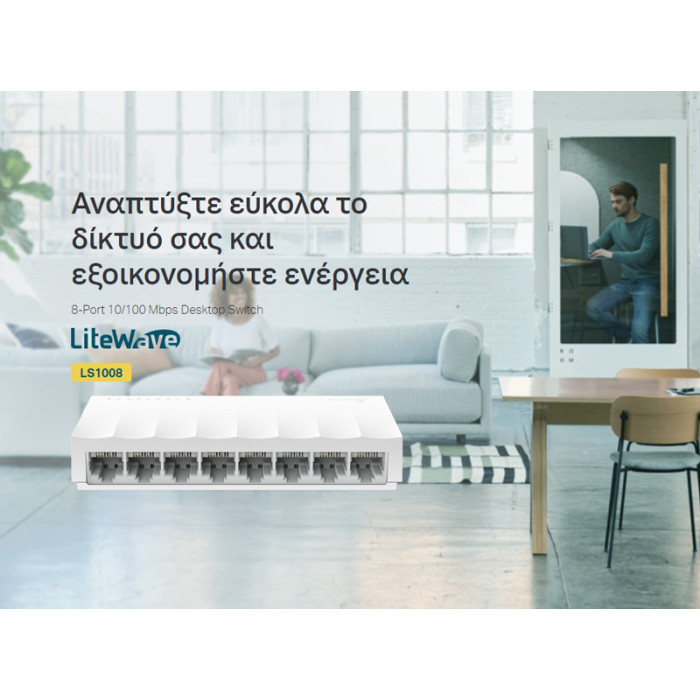 Το desktop switch LiteWave LS1008 σας επιτρέπει να επεκτείνετε τις θύρες δικτύου σας με 8x θύρες με ταχύτητες 10/100Mbps.