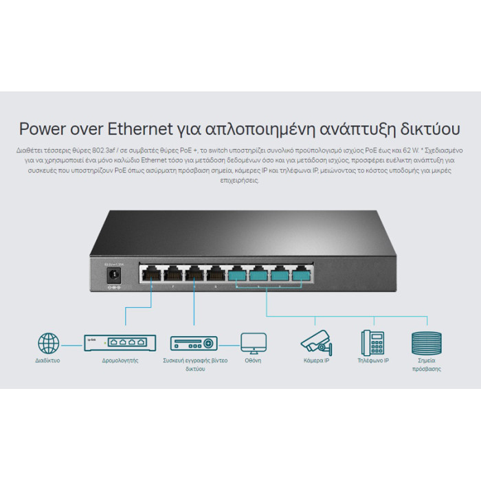 PoE Ports (RJ45): Πρότυπο: 802.3af / at compliant, Θύρες PoE: 4 θύρες, Τροφοδοσία: 62 W
