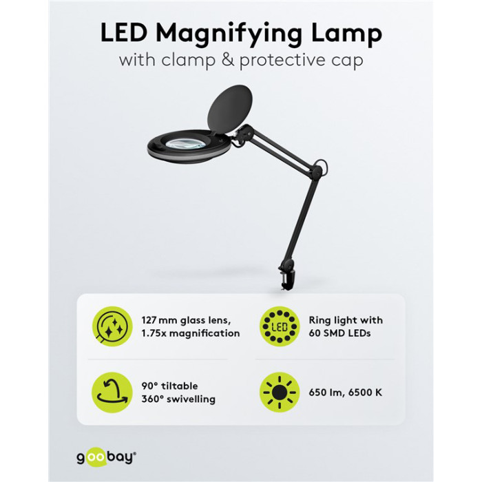 Μεγεθυντικός φακός της Goobay διαμέτρου 127mm, με 3 διόπτρες και μεγέθυνση 1.75x. Διαθέτει προστατευτικό καπάκι για την κάλυψη του φακού όταν δεν χρησιμοποιείται και φωτιστικό δακτύλιο με 60 SMD LED υψηλής απόδοσης για άνετη εργασία ακόμη και σε σκοτεινά μέρη. Ο βραχίωνας του είναι αρθρωτός και υποστηρίζει ρύθμιση κλίσης και περιστροφή, γεγονός που προσφέρει μεγαλύτερη ευελιξία κατά την διάρκεια των εργασιών σας.