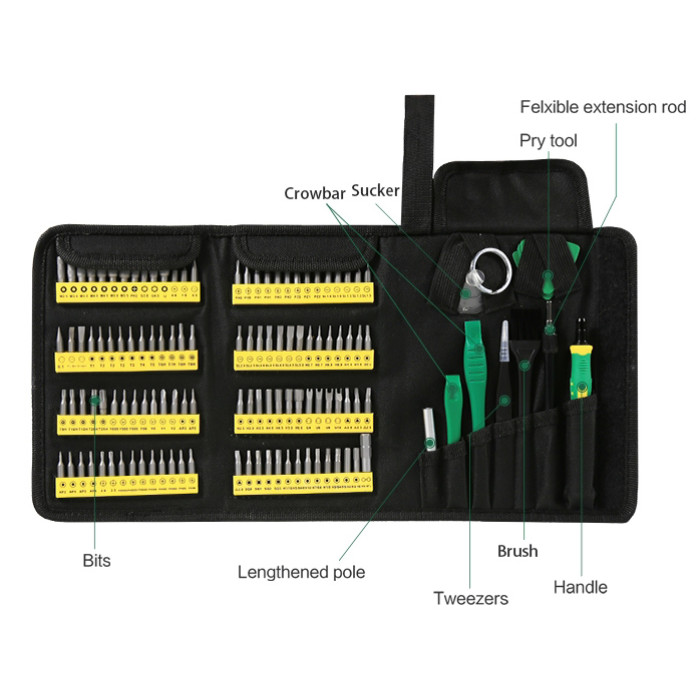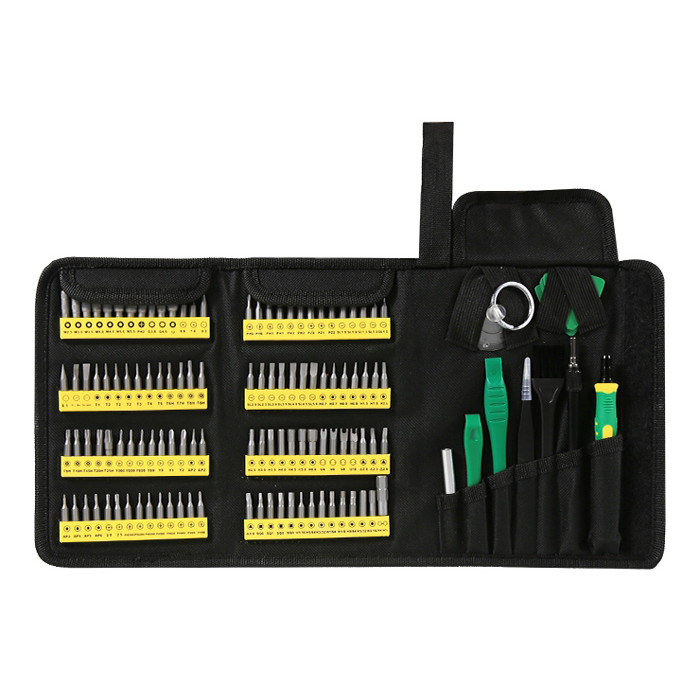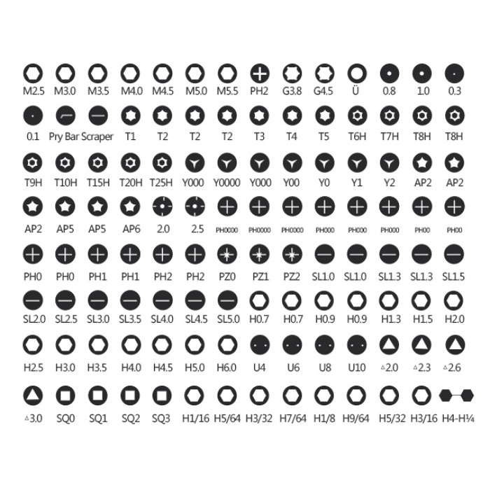 1x screwdriver set (M2.5, M3.0, M3.5, M4.0, M4.5, M5.0, M5.5, G3.8, G4.5, U, 0.8, 1.0, 0.3, 0.1, Pry bar, Scrapper, T1, T2, T3, T4, T5, T6H, T7H, 2x T8H, T9H, T10H, T15H, T20H, T25H, 2x Y000, Y00, Y0000, Y0, Y1, Y2, 3x AP2, 2AP5, AP6, 2.0, 2.0, 3x PH0000, 3x PH000, 2x PH00, 2x PH0, 2x PH1, 2x PH2, PZ0, PZ1, PZ2, 2x SL1.0, 2x SL1.3, SL1.5, SL2.0, SL2.5, SL3.0, SL3.5, SL4.0, SL4.5, SL5.0, 2x H0.7, 2x H0.9, H1.3, H1.5, H2.0, H2.5, H3.0, H3.5, H4.0, H4.5, H5.0, H6.0, U4, U6, U8, U10, 2.0, 2.3, 2.6, 3.0, SQ0, SQ1, SQ2, SQ3, H1/16, H5/64, H3/32, H7/64, H1/8, H9/64, H5/32, H3/16, H4-H1/4