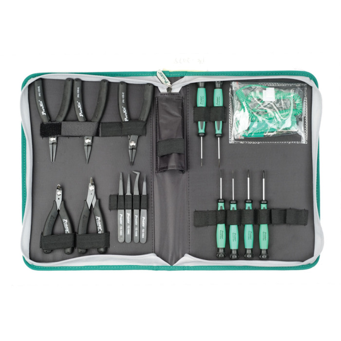 Σετ εργαλείων της PROSKIT το οποίο αποτελείται από 2x μυτοτσίμπιδα, 2x πλαγιοκόφτες, πλατυτσίμπιδο, 6x κατσαβίδια, 4x τσιμπίδες και ηλεκτροστατικό βραχιόλι.