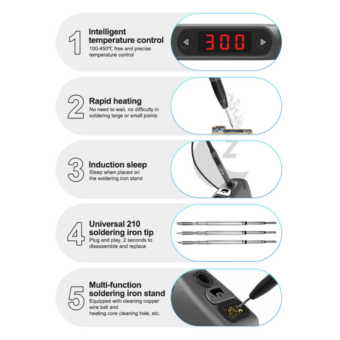 Μαζί με τον σταθμό, συμπεριλαμβάνεται κολλητήρι που αναπτύσσει θερμοκρασίες από 100 °C έως 450 °C και συνδέεται μέσω καλωδίου USB-C.
