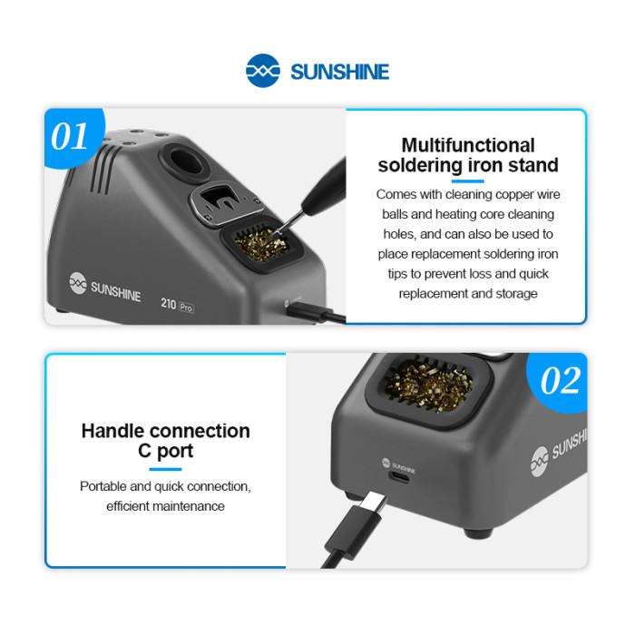 Σταθμός κόλλησης της Sunshine με υψηλή ισχύ 110W. Ενσωματώνει βάση για κολλητήρι και για συρμάτινο σφουγγάρι, αλλά και αποθηκευτικό χώρο για τοποθέτηση των μυτών κολλητηρίου. Επιπλέον, διαθέτει εύκολο σύστημα αλλαγής μύτης, που επιτρέπει την αλλαγή της ακόμη και όταν η μύτη είναι ζεστή.