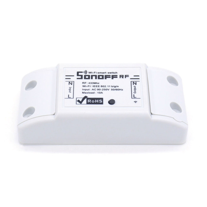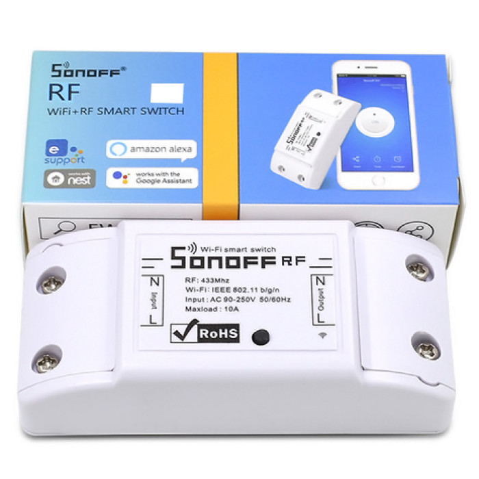 Το Sonoff RF είναι μια οικονομική συσκευή χαμηλού κόστους, που σας βοηθά να μετατρέψετε το σπίτι σας σε "έξυπνο σπίτι". Είναι ένας WiFi ασύρματος διακόπτης που μπορεί να συνδεθεί σε οικιακές συσκευές διαφορετικών τύπων και κατασκευαστών. Το Sonoff στέλνει στοιχεία σε cloud πλατφόρμα μέσα από το WiFi Router και σας επιτρέπει να ελέγχετε από μακριά όλες τις οικιακές συσκευές σας με την εφαρμογή eWeLink από το smartphone σας. Το Sonoff κάνει όλες τις οικιακές συσκευές σας έξυπνες, και όσο το τηλέφωνό σας είναι συνδεδεμένο στο δίκτυο μπορείτε να ελέγξετε από οπουδήποτε τις οικιακές συσκευές σας. θέτοντας χρονικά όρια για τις οικιακές συσκευές σας, μπορείτε να έχετε περισσότερο ελεύθερο χρόνο. Συνεργάζεται με το RF remote controller (δεν συμπεριλαμβάνεται στη συσκευασία), που σας επιτρέπει να έχετε έλεγχο στις οικιακές συσκευές σας.