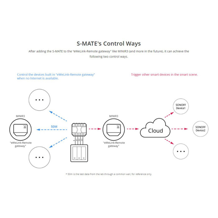 Επικοινωνεί ασύρματα με το MINIR3 μέσω του eWeLink-Remote signal (εμβέλεια έως 50m) επιτρέποντας σας να ελέγχετε τις συσκευές σας ακόμη και όταν δεν υπάρχει διαθέσιμη σύνδεση στο internet αλλά και να ενεργοποιήσετε περισσότερες smart συσκευές στις smart σκηνές σας.