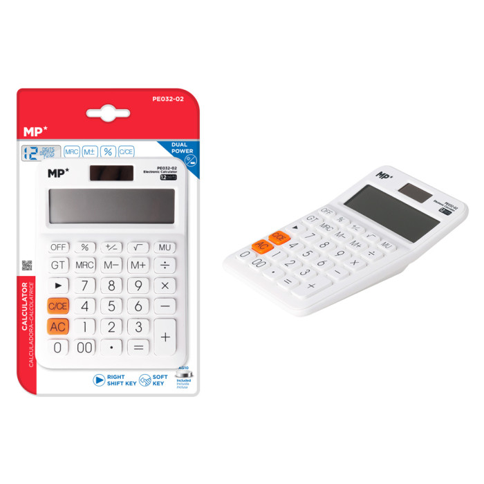 MP αριθμομηχανή PE032-01, ηλιακό & μπαταρίες, 12 ψηφία, λευκή