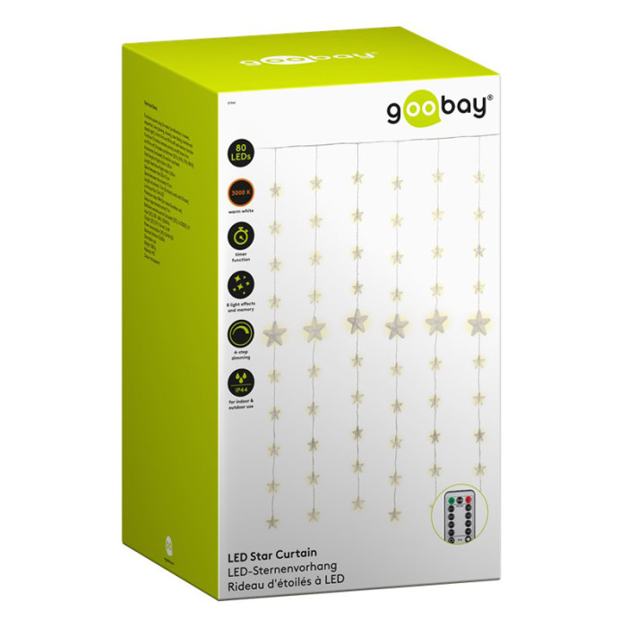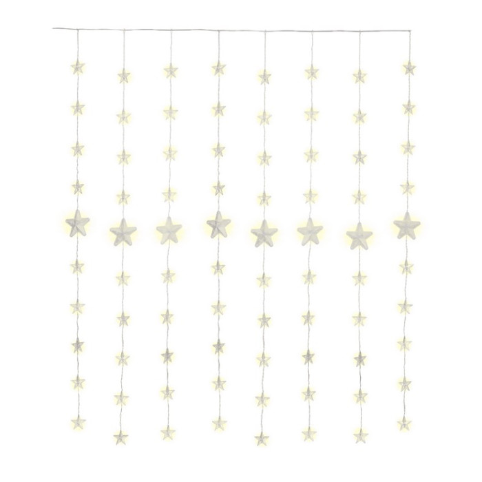 Λαμπάκια LED τύπου (80 LEDs) κουρτίνα με διακοσμητικά αστέρια, διαφανές καλώδιο συνολικού μήκους 6.05m και θερμοκρασία χρώματος 3000K (θερμό λευκό). Είναι ιδανικά για την χριστουγεννιάτικη διακόσμηση σε οποιονδήποτε εσωτερικό και εξωτερικό χώρο χάρη στον βαθμό προστασίας IP44.