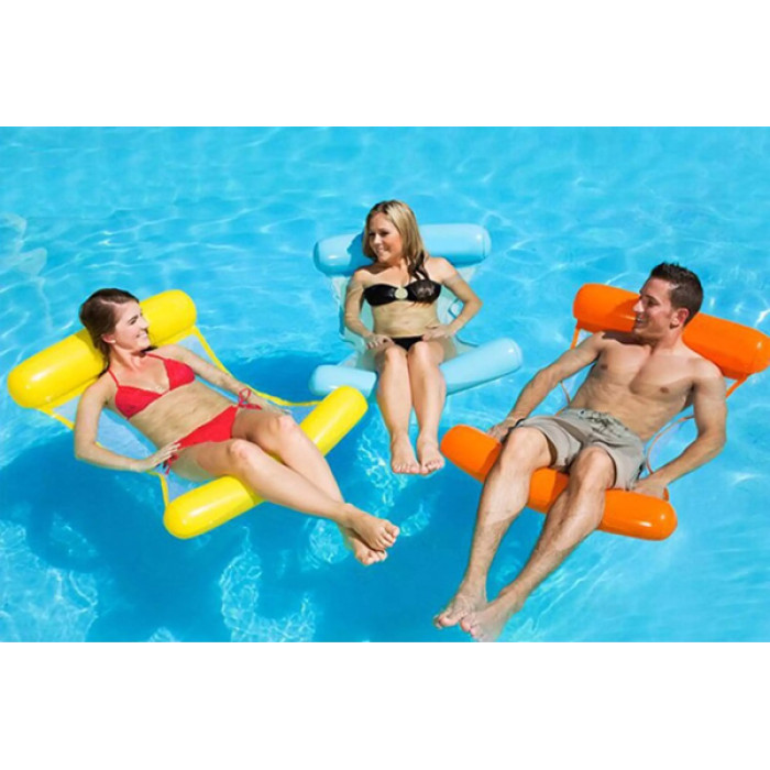 Καρέκλα με δίχτυ και φουσκωτά άκρα που επιπλέει στο νερό, ιδανική για θάλασσα και πισινά.