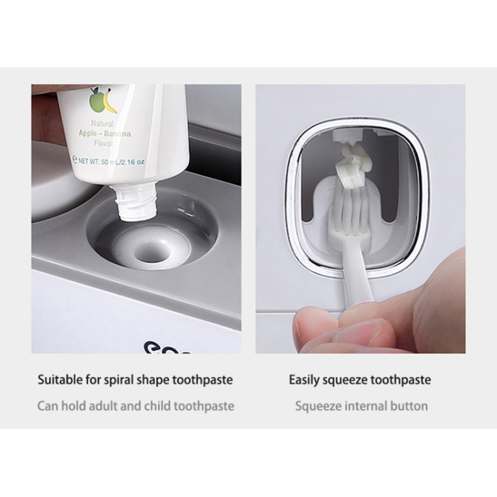 Τοποθετείται εύκολα στον τοίχο με αυτοκόλλητη βάση η οποία αποσπάται από τον διανεμητή. Με τον διανεμητή θα βάλετε εύκολα οδοντόκρεμα στην οδοντόβουρτσά σας, σπρώχνοντας την οδοντόβουρτσα στην ειδική εσοχή του διανεμητή (διαθέτει 2 διανεμητές). Επίσης, θα αποθηκεύσετε τις οδοντόβουρτσες σας, αποφεύγοντας την έκθεση τους στον χώρο.