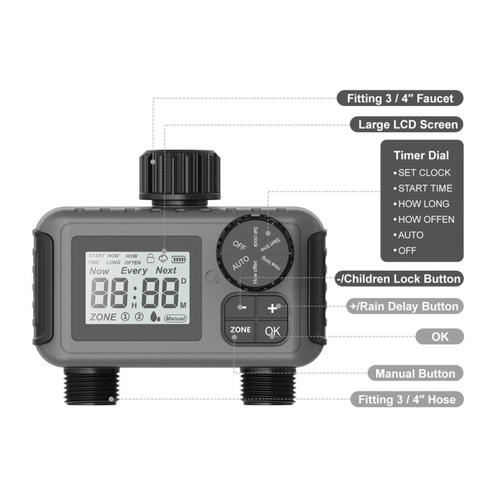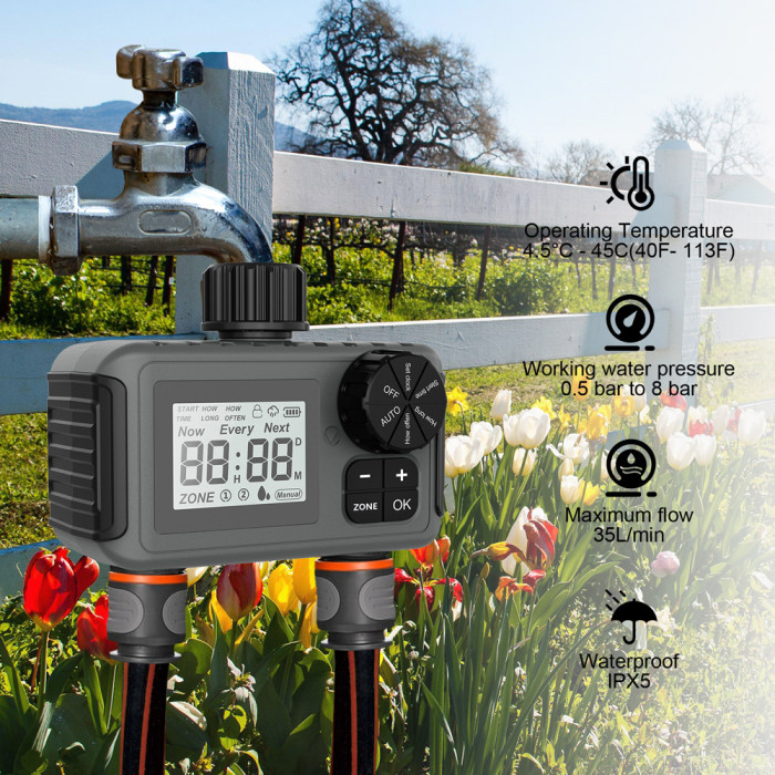 Σας επιτρέπει με εύκολο τρόπο να ορίζετε τον χρόνο του ποτίσματος και την διάρκεια του σε ήμερες. Επιπλέον, διαθέτει λειτουργία αναβολής του ποτίσματος λόγο βροχής.