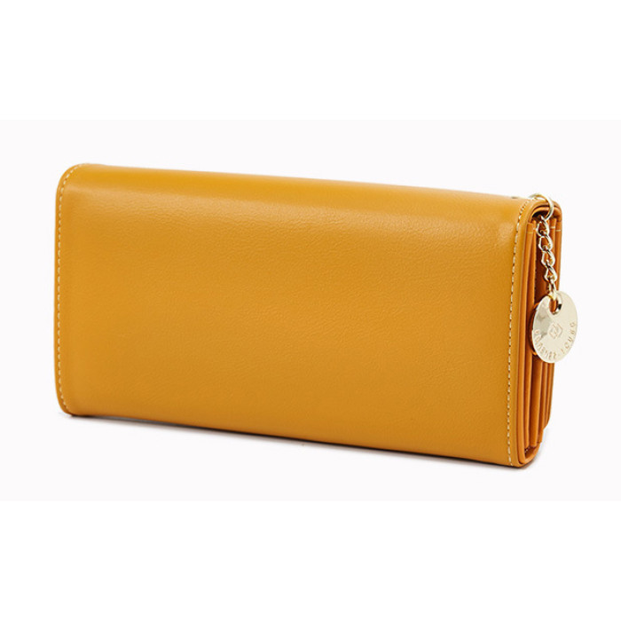 Κομψό, υψηλής ποιότητας γυναικείο πορτοφόλι σε κίτρινο χρώμα με χρυσές λεπτομέρειες. Διαθέτει πολλαπλές θέσεις στο εσωτερικό του για χαρτονομίσματα, 2 μέρη με φερμουάρ για ψιλά και 14 θέσεις για κάρτες.