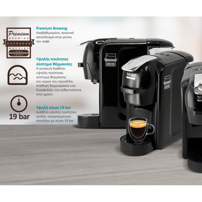 Η καφετιέρα espresso 3 σε 1 της Bruno, συνδυάζει 3 λειτουργίες σε μία συσκευή. Με 3 ειδικούς αντάπτορες που εφαρμόζονται πολύ εύκολα (συρταρωτά) στη συσκευή, μπορεί να παρασκευάσει καφέ χρησιμοποιώντας καφέ σε σκόνη ή κάψουλες τύπου Nespresso αλλά και Dolce Gusto καλύπτοντας έτσι τις δημοφιλέστερες επιλογές.