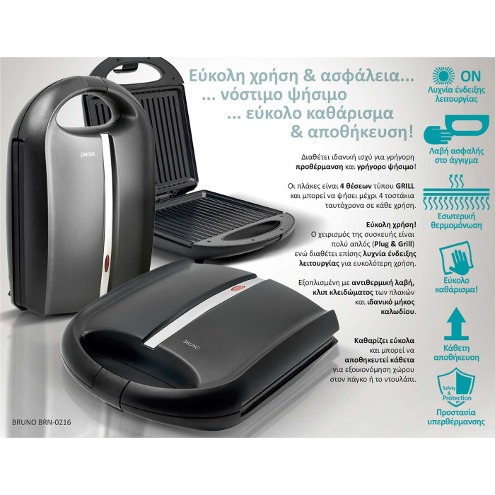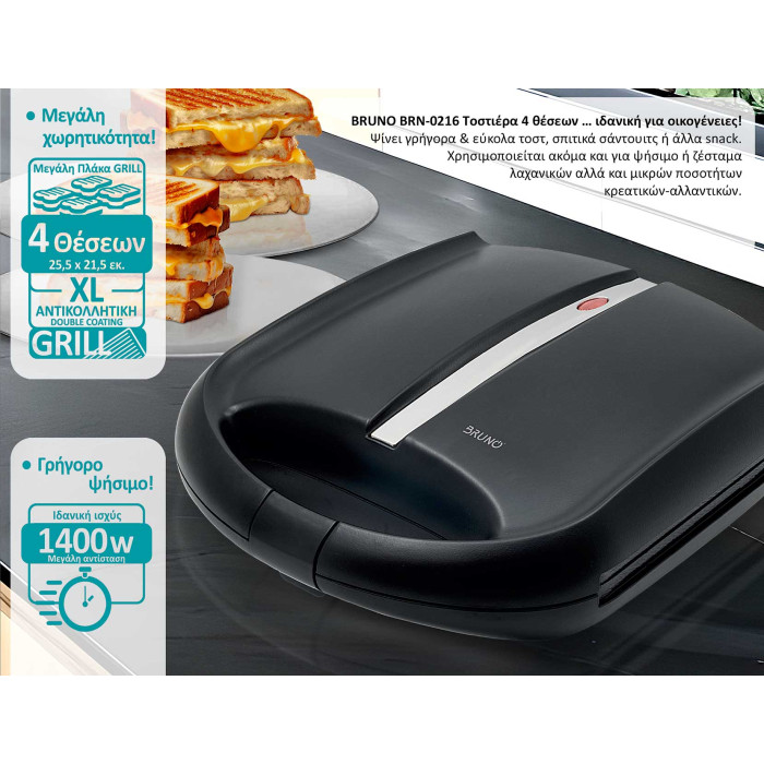 Η Ψηστιέρα-Τοστιέρα για 4 τοστ BRUNO BRN-0216 είναι ιδανική για ψήσιμο τοστ, σπιτικών σάντουιτς και άλλων snack σε σύντομο χρόνο.