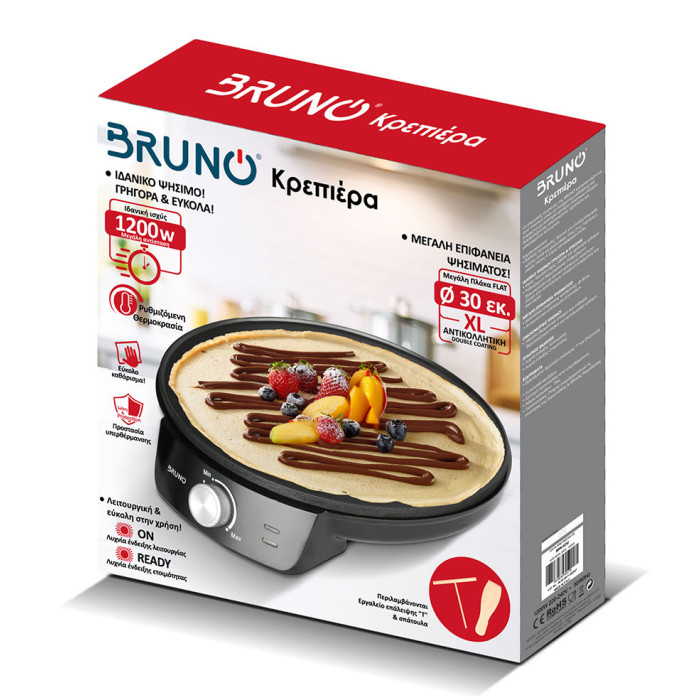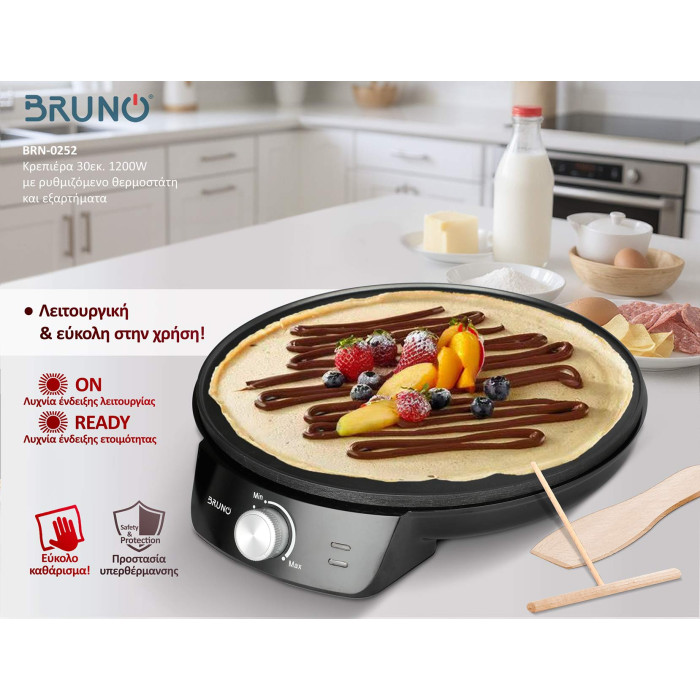 BRUNO κρεπιέρα BRN-0252, 30εκ, 1200W, με ρυθμιζόμενο θερμοστάτη & εξαρτήματα, μαύρη