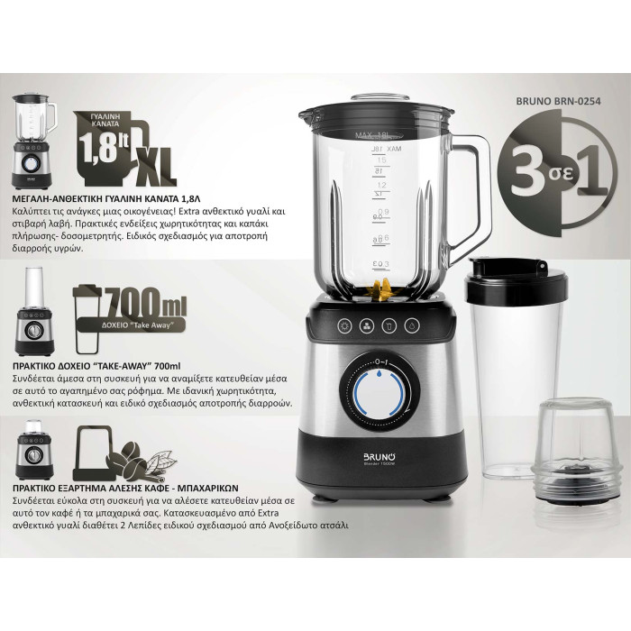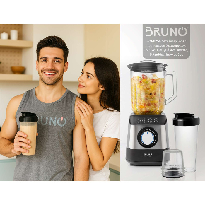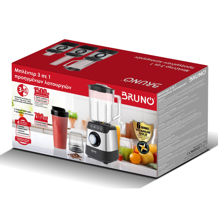 BRUNO μπλέντερ 3 σε 1 προηγμένων λειτουργιών BRN-0254, 1500W, 1.8L γυάλινη κανάτα, 6 λεπίδες, inox-μαύρο