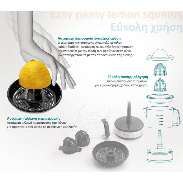 Ο χειρισμός της συσκευής είναι πολύ εύκολος καθώς διαθέτει αυτόματη λειτουργία έναρξης/παύσης, ενεργοποιείτε με την πίεση των φρούτων στον κώνο και απενεργοποιείτε με την αποδέσμευση της πίεσης.