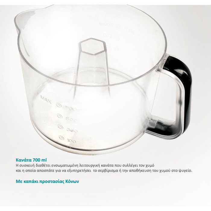 Το φίλτρο διαχωρισμού του πολτού είναι αποσπώμενο για εύκολο καθάρισμα ενώ η αυτόματη αλλαγή περιστροφής του κώνου προστατεύει το μοτέρ σε περίπτωση εμπλοκής.