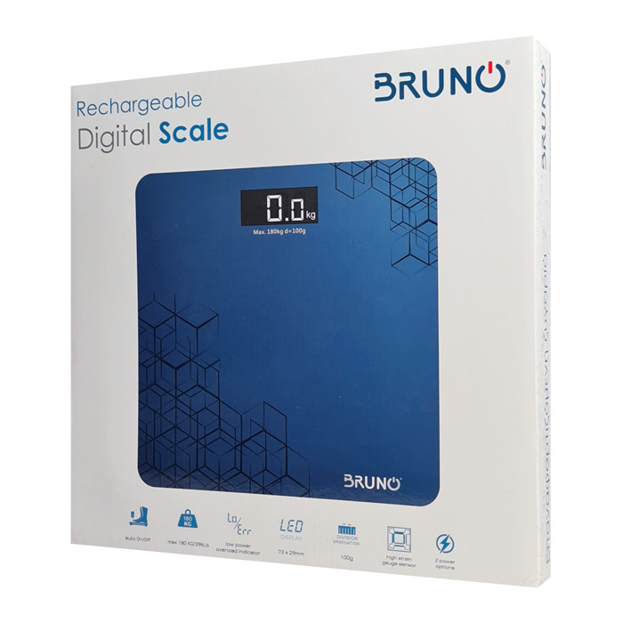 Ψηφιακή ζυγαριά της Bruno με επιφάνεια κατασκευασμένη από tempered glass και μεγάλη ευανάγνωστη οθόνη LCD. Διαθέτει 2 μονάδες μέτρησης (kg, lb) με δυνατότητα μέτρησης έως 180kg και ευαισθησία 0.1kg για ακριβής μέτρηση του σωματικού βάρους.