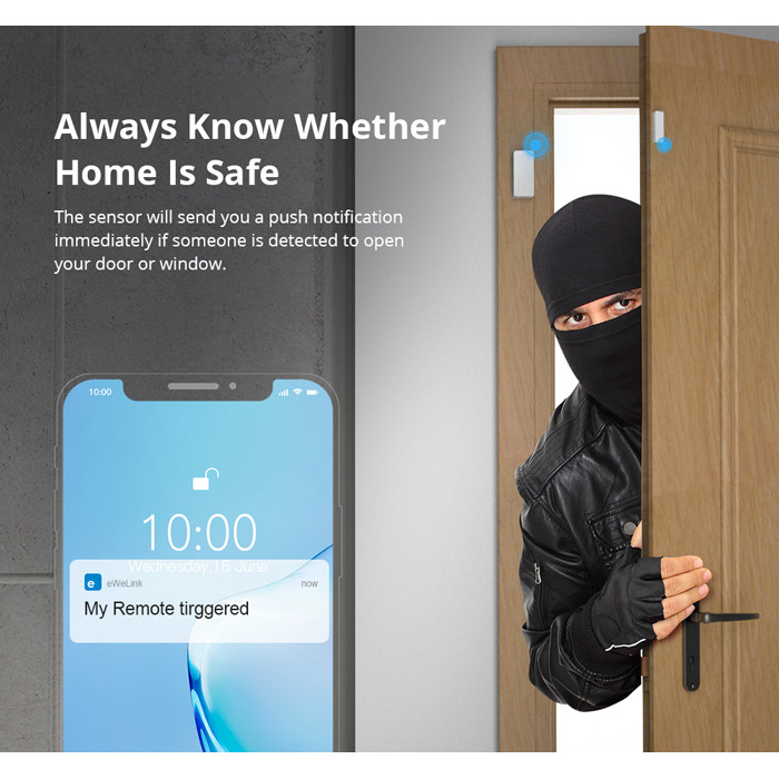 Ασύρματος μαγνητικός αισθητήρας παραθύρου και πόρτα της Sonoff. Αποτελείται από έναν πομπό και μια μαγνητική μπάρα, όταν αφαιρεθεί η μαγνητική μπάρα ο πομπός στέλνει ασύρματο σήμα συναγερμού. Υποστηρίζει push ειδοποίησης στο smartphone μέσω της εφαρμογής eWeLink. Τροφοδοτείται από 2 μπαταρίες AAA 1.5V(δεν συμπεριλαμβάνονται)