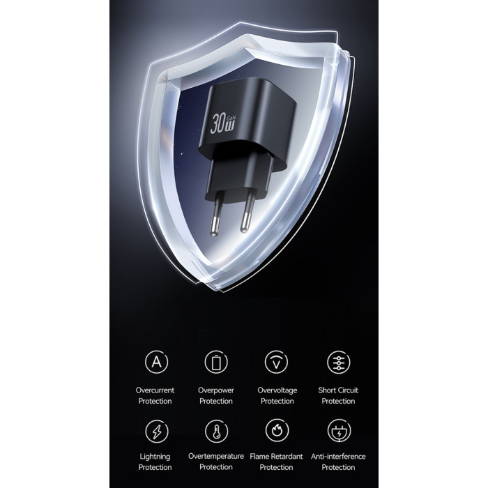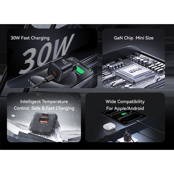 USAMS φορτιστής τοίχου CC263, USB & USB-C, 30W, GaN, μαύρος