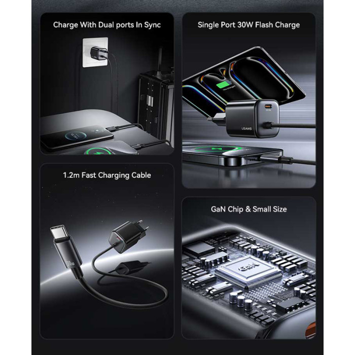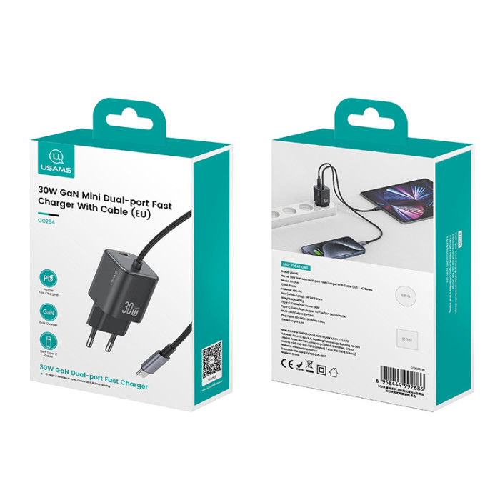 USAMS φορτιστής τοίχου CC264 με καλώδιο, USB-C, 30W, GaN, μαύρος