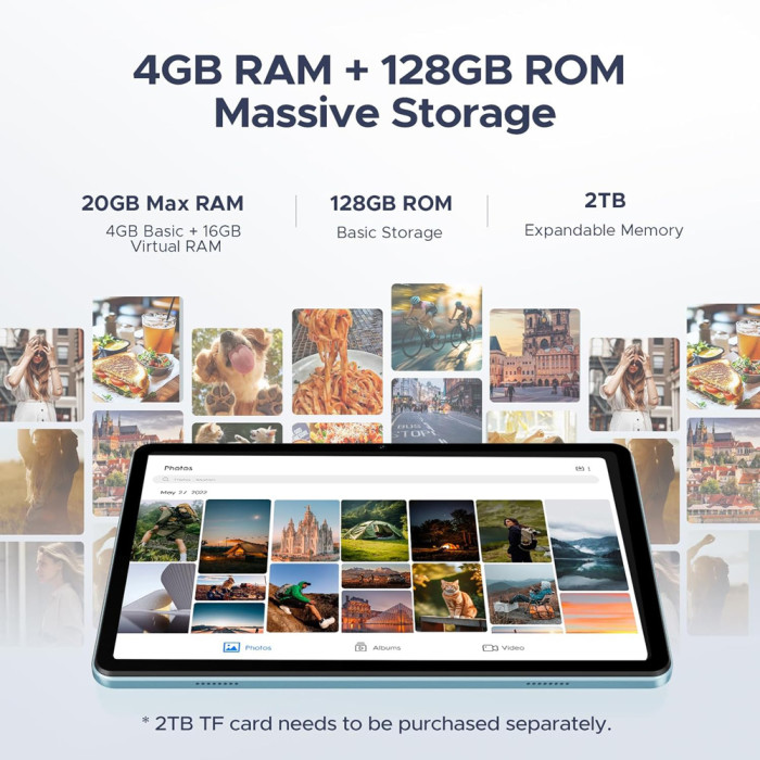 Με 4GB (+16GB virtual) RAM και 128GB ROM για να αποθηκεύετε τα αγαπημένα σας αρχεία, φωτογραφίες και βίντεο. Επιπλέον, προσφέρει την δυνατότητα να επεκτείνετε τον χώρο αποθήκευσης του tablet με κάρτα micro SD έως 2TB.