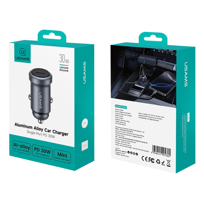 USAMS φορτιστής αυτοκινήτου CC321, USB-C, 30W, γκρι
