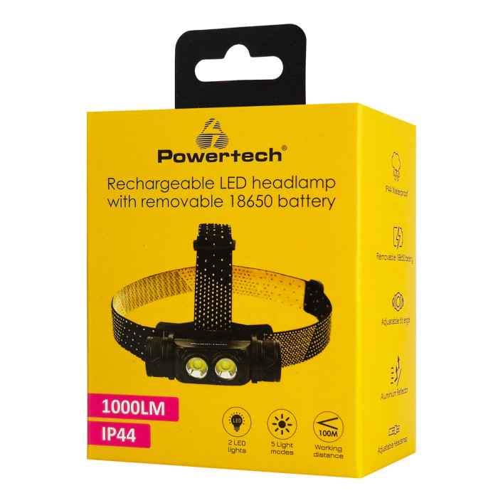 POWERTECH LED φακός κεφαλής PT-1549, επαναφορτιζόμενος, 1000lm, IP44, μαύρος
