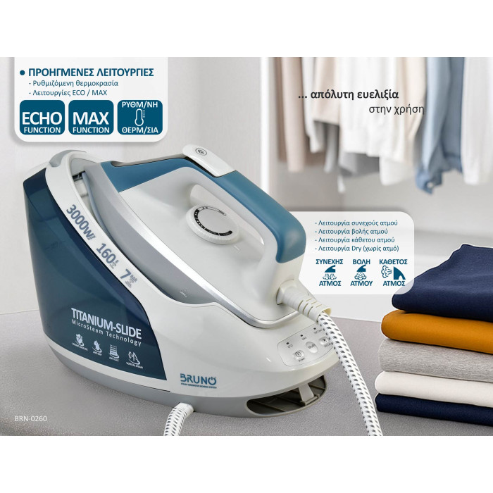 Το Σύστημα σιδερώματος BRUNO BRN-0260 υπόσχεται άψογο σιδέρωμα με λιγότερα περάσματα σε χρόνο ρεκόρ, καθώς διαθέτει υψηλή ισχύ 3000W και αποδίδει πανίσχυρο ατμό (>7bar-160γρ/λεπτό) ενώ προθερμαίνεται ταχύτατα!