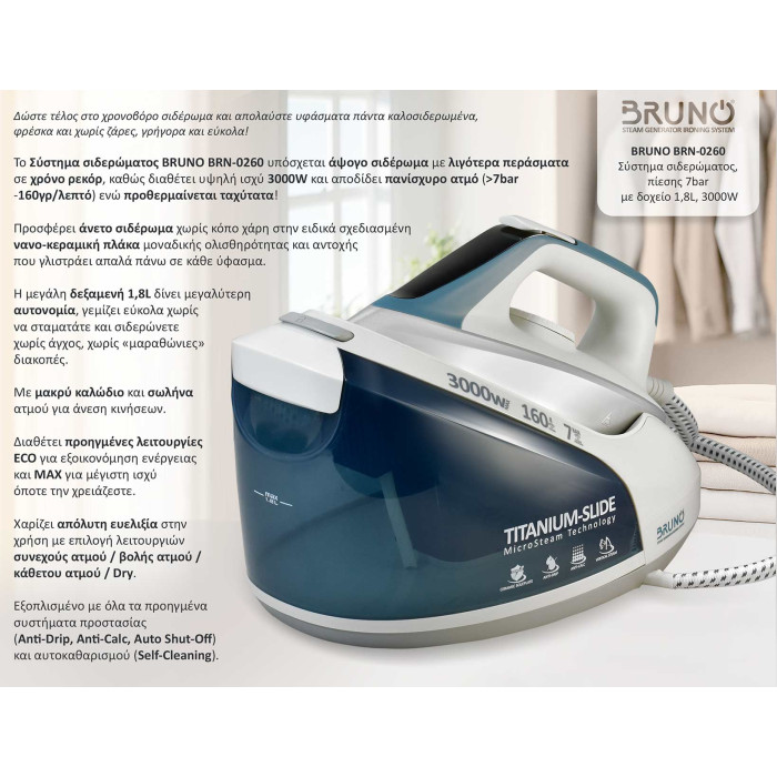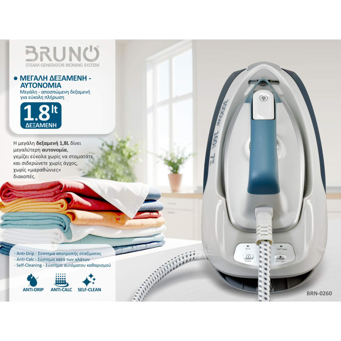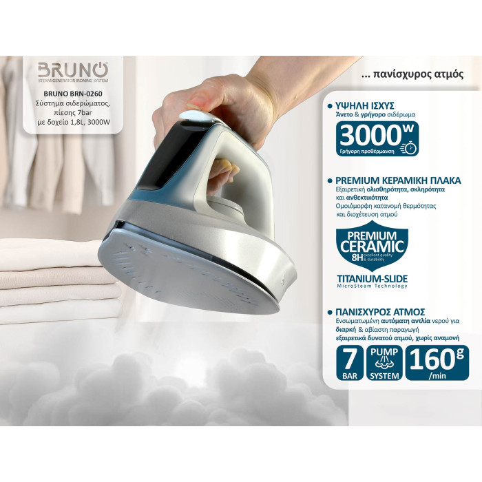BRUNO σύστημα σιδερώματος BRN-0260, πίεσης 7bar, με δοχείο 1.8L, 3000W